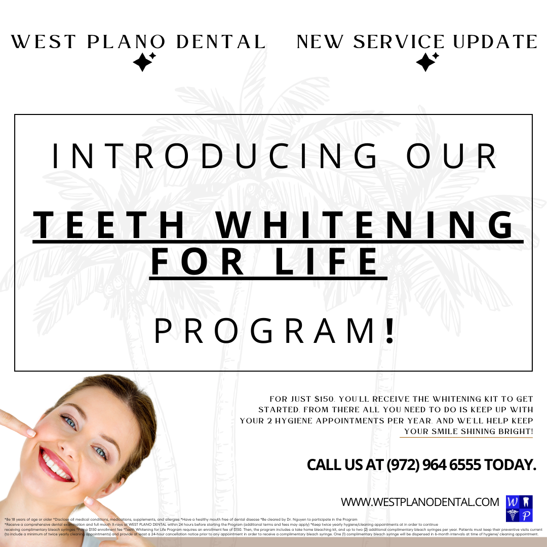 ✨ Want a whiter smile for life? We’ve got you covered! ✨ Join our Whitening for Life Program for a one-time $150 enrollment fee and receive a professional whitening kit—PLUS free whitening touch-ups every six months! Keep your smile bright year-round!